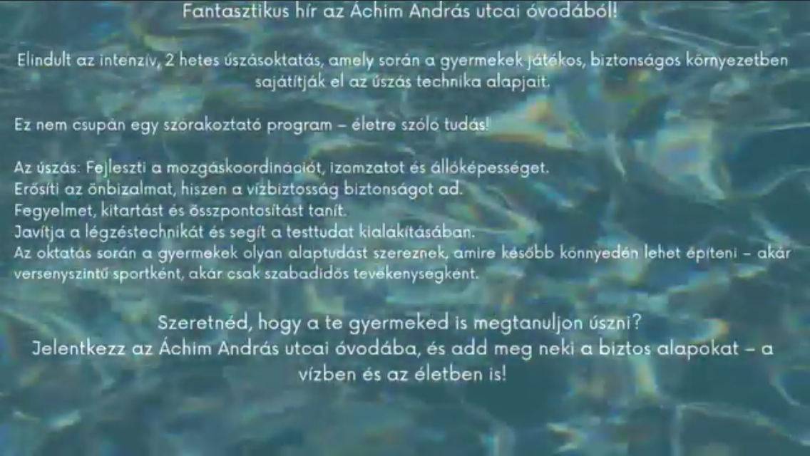 Fantasztikus hír az Áchim András Utcai ÓvodábólElindult az intenzív, 2 hetes úszásoktatás, amely során a gyermekek játékos, biztonságos környezetben sajátítják el az úszás technika alapjait. Ez nem csupán egy szórakoztató program – életre szóló tudás!